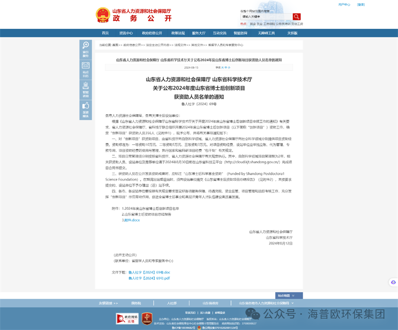 2024 年 8 月,諸城人社廳傳來令人振奮的消息。山東省人社廳與科技廳聯合公布年度博士后創新項目獲資助人員名單,海普歐環保集團有限公司的姜東兵博士后榮耀在列。
