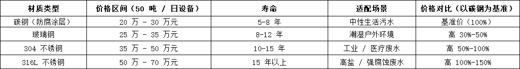 •中型設(shè)備(50-100 噸 / 日):服務(wù)村鎮(zhèn)集中區(qū),需配套預(yù)處理系統(tǒng),碳鋼材質(zhì)報(bào)價(jià) 20 萬 - 40 萬元,不銹鋼材質(zhì)因耐腐性升級(jí),價(jià)格升至 35 萬 - 60 萬元。