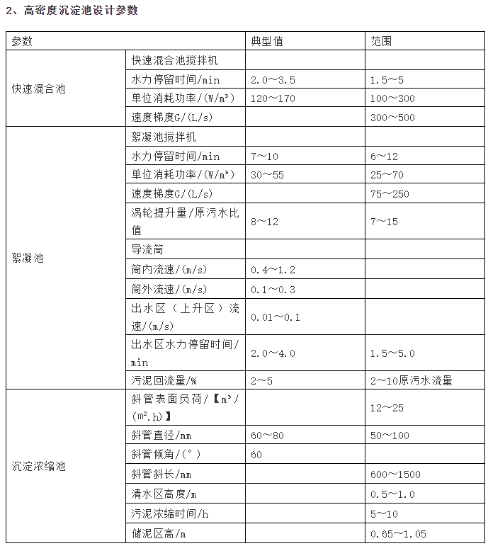 高密度沉淀池是混凝沉淀計算的總結和發展,該技術結合了技術和污泥濃縮技術,可以進一步去除二級出水中的SS、TP、COD等污染物。高密度沉淀池分為反應區、沉淀區、出水區三個區。在反應區,渦輪攪拌機以達到10倍進水的內循環率進行攪拌,剪切水中原油的懸浮固定,再次形成大容易沉降的絮凝體。在沉淀區,容易沉淀的高密度懸浮物迅速沉降,但微小的棉體倍斜管捕獲最終沒有高質量的出水通過池頂集水收集排出。