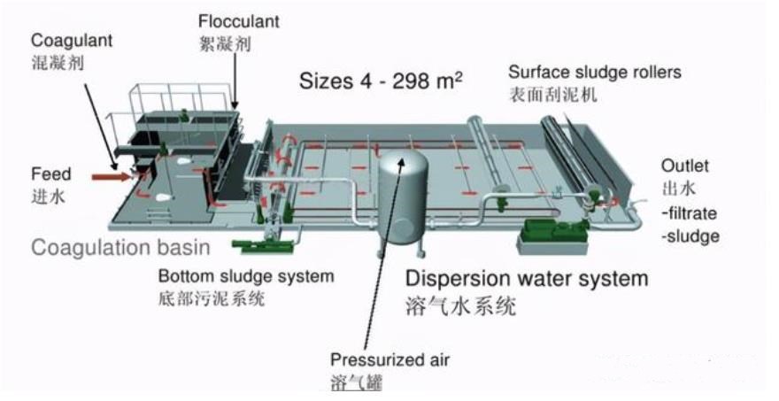 它是在一定條件下,將大量空氣溶解在水中,形成溶氣水,作為工作介質,通過釋放器減壓,快速釋放,產生大量微細氣泡粘附于經過混凝反應后的“礬花”中,作為工作介質,通過釋放器釋放出大量微細氣泡,迅速釋放出大量微細氣泡。